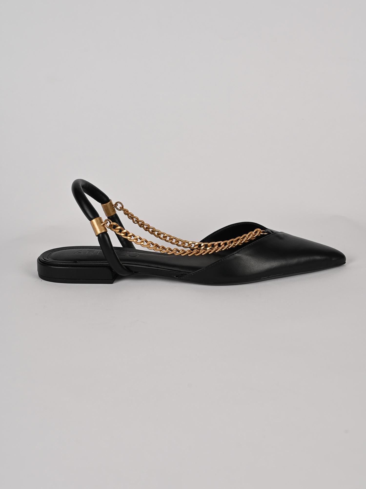 Slingback in pelle, tacco piatto, tinta unita, design aperto presenta un taglio a V sulla tomaia e un cinturino intorno al tallone, collegato da una catena metallica nella parte superiore del piede, suola in gomma logata, made in Brazil.