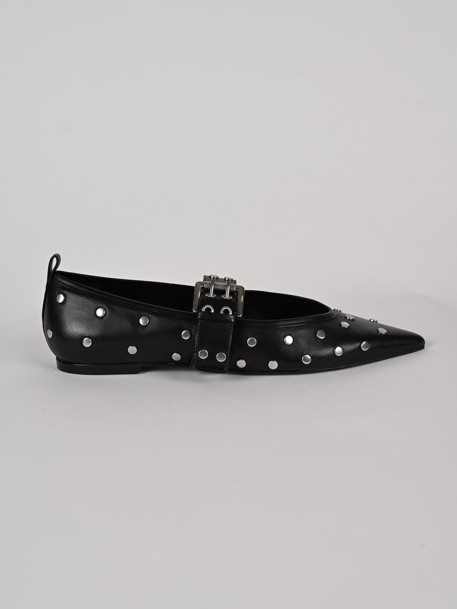 Ballerina borchiata in pelle nera , con cinturino, tacco piatto, punta affusolata, interamente realizzata in pelle, suola in pelle, made in Brazil.