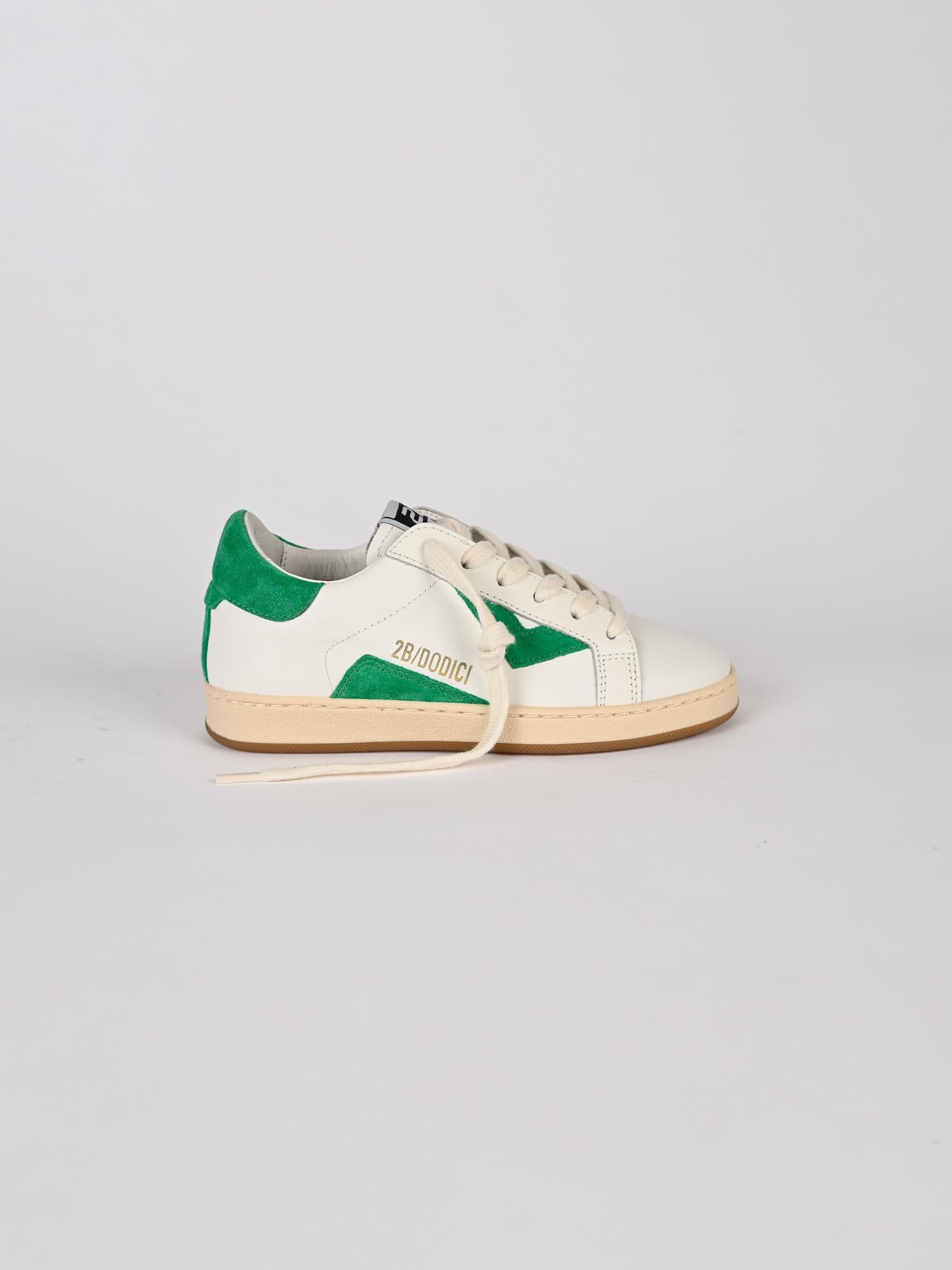 Sneakers bambino bianca in vera pelle, tomaia arrontondata, inserti in camoscio verde, chiusura con lacci. Suola ultralight in gomma logata. Realizzata interamente in Italia e rifinita a mano.