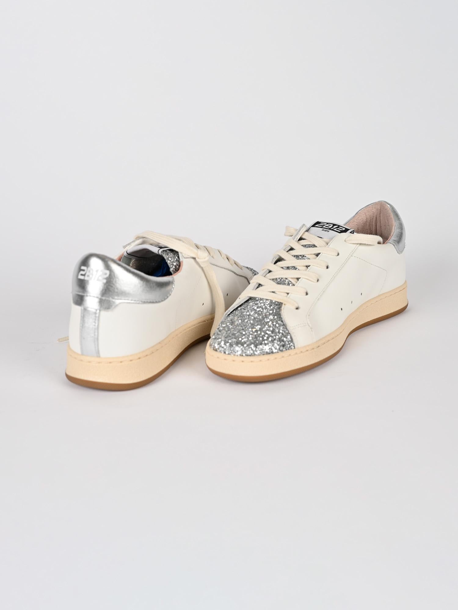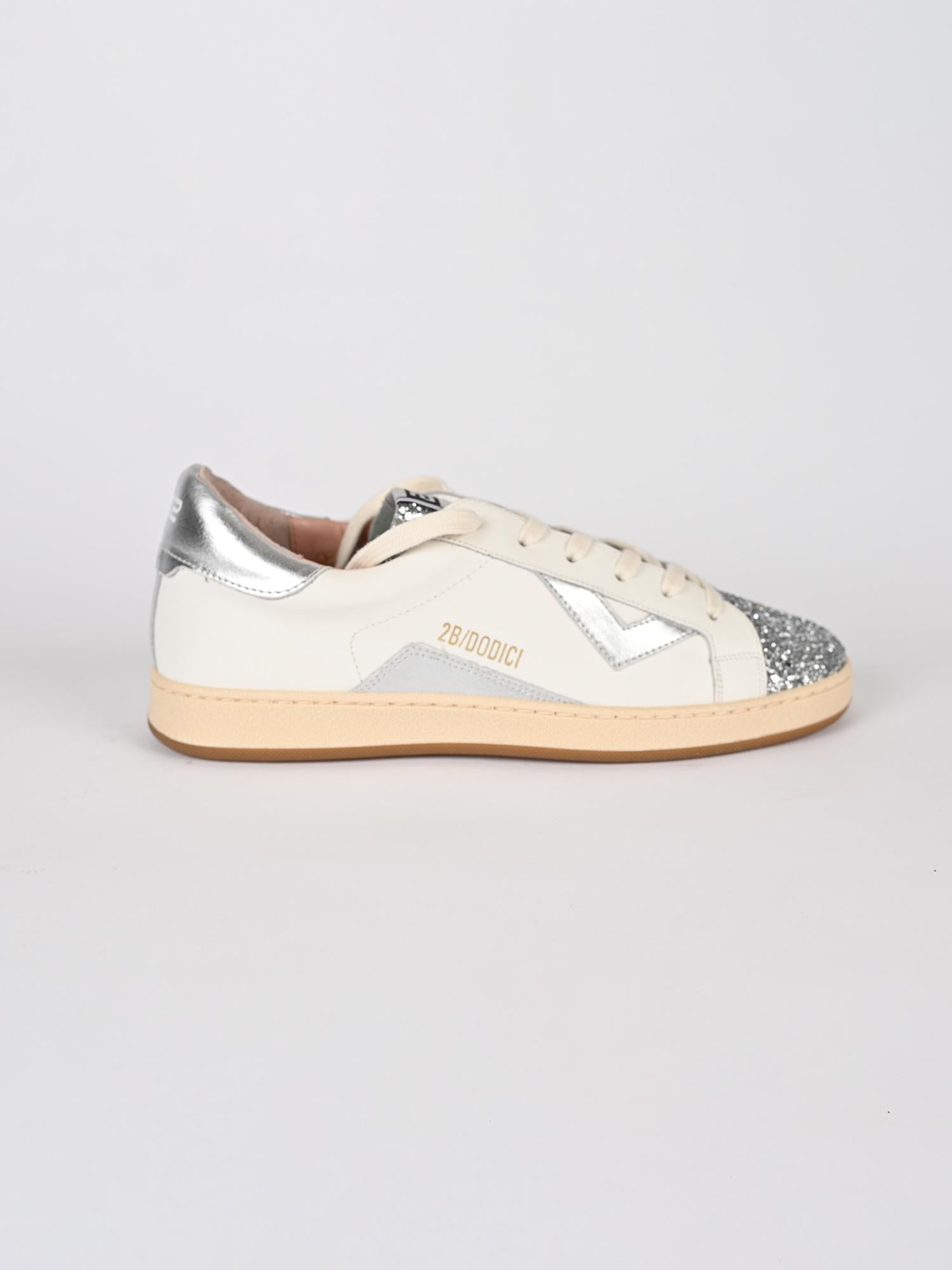 Sneakers ragazza in vera pelle, tomaia arrotondata, inserti in pelle argentata a contrasto, inserti in glitter argento, chiusura con lacci. Suola ultralight in gomma logata. Realizzata interamente in Italia e rifinita a mano.